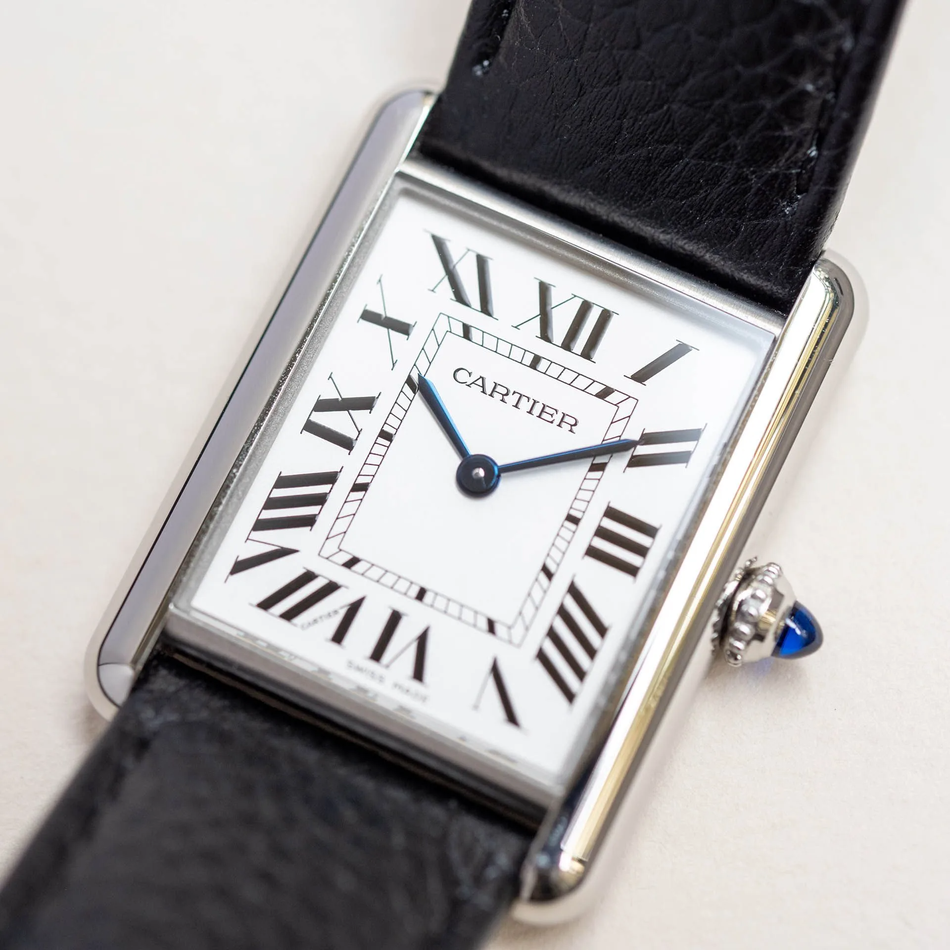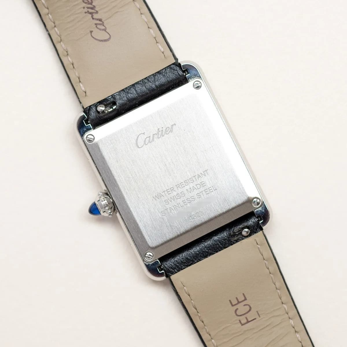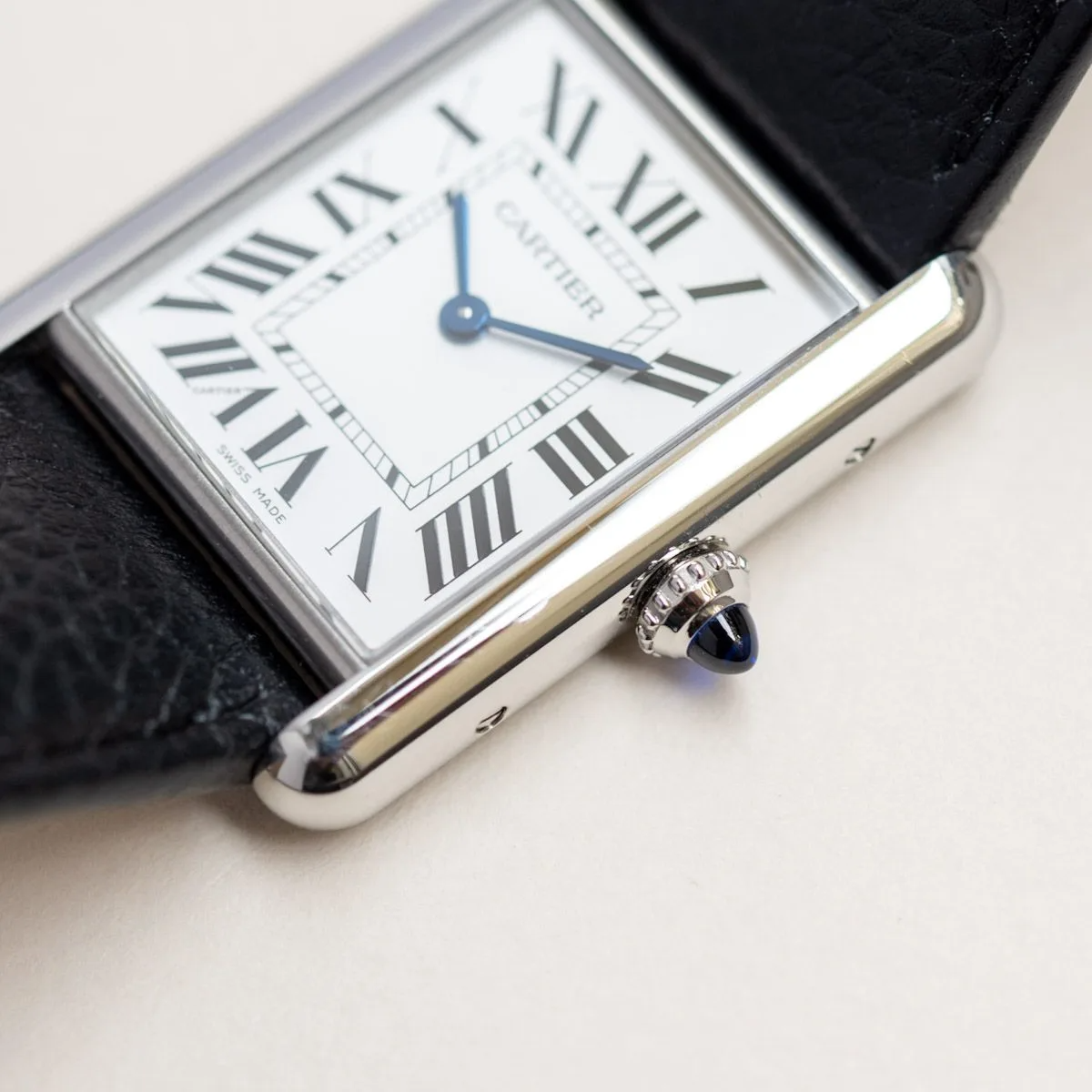 The Cartier Tank Must de Cartier watch in its large model features a rectangular steel case, a white lacquered dial, and a steel ardillon buckle. It is powered by a high autonomy quartz movement. The watch is water-resistant up to 3 bar (approximately 30 meters). The dimensions of the case are 33.7 mm x 25.5 mm with a thickness of 6.6 mm. It also features a beaded crown set with a synthetic cabochon-shaped spinel, and sword-shaped hands.