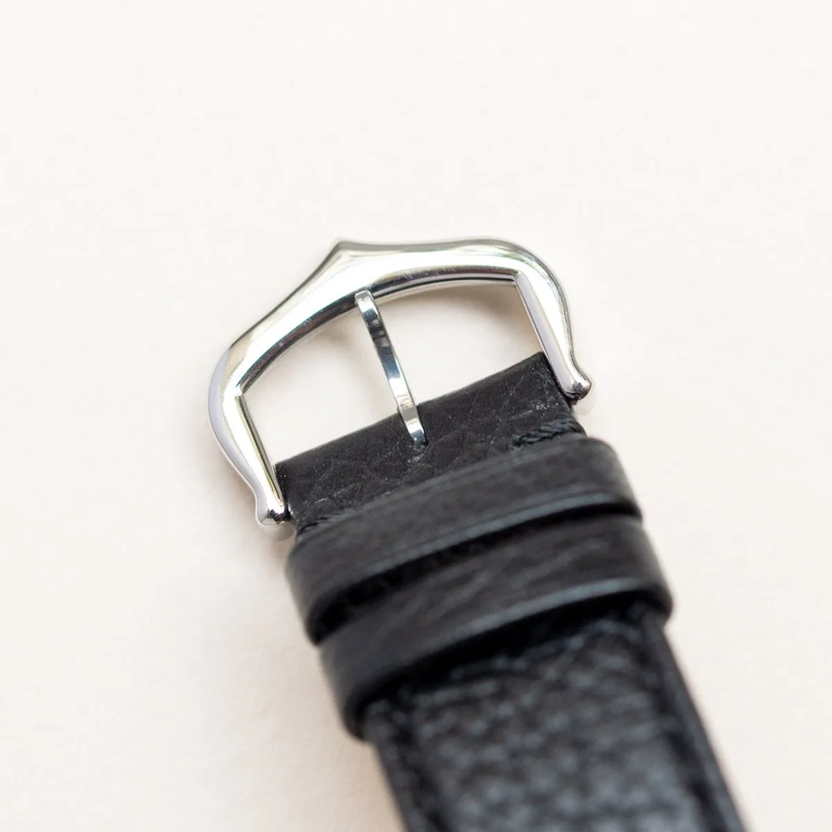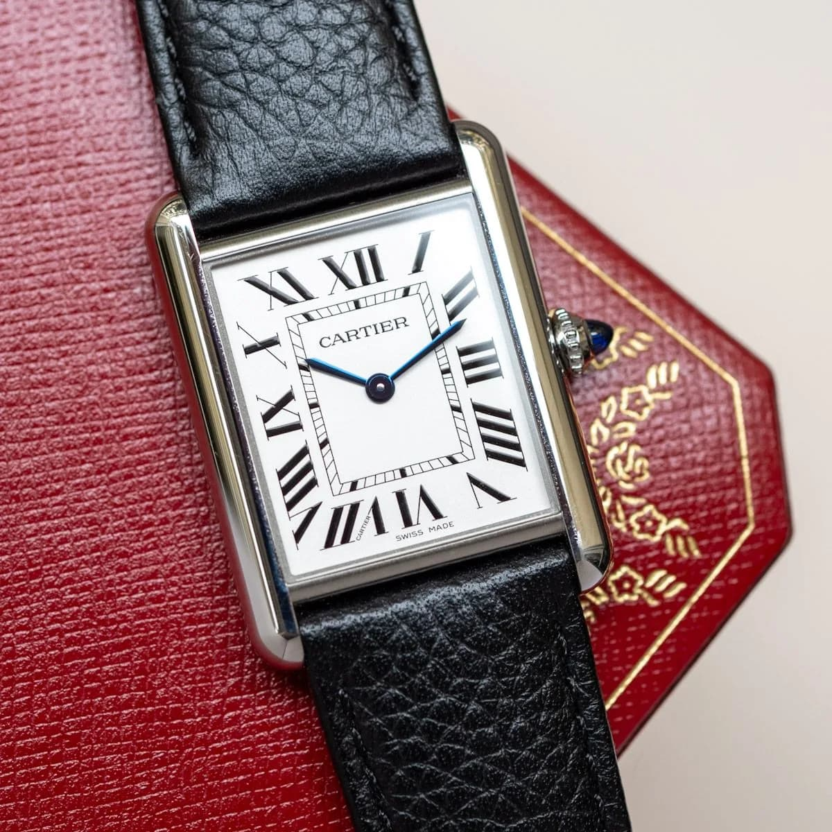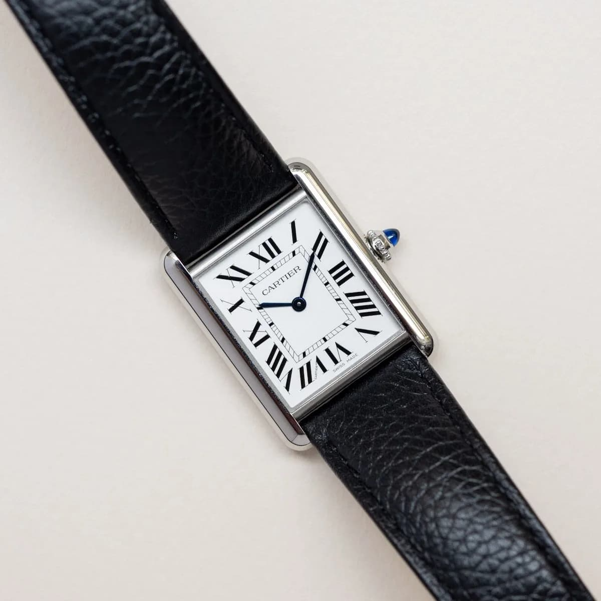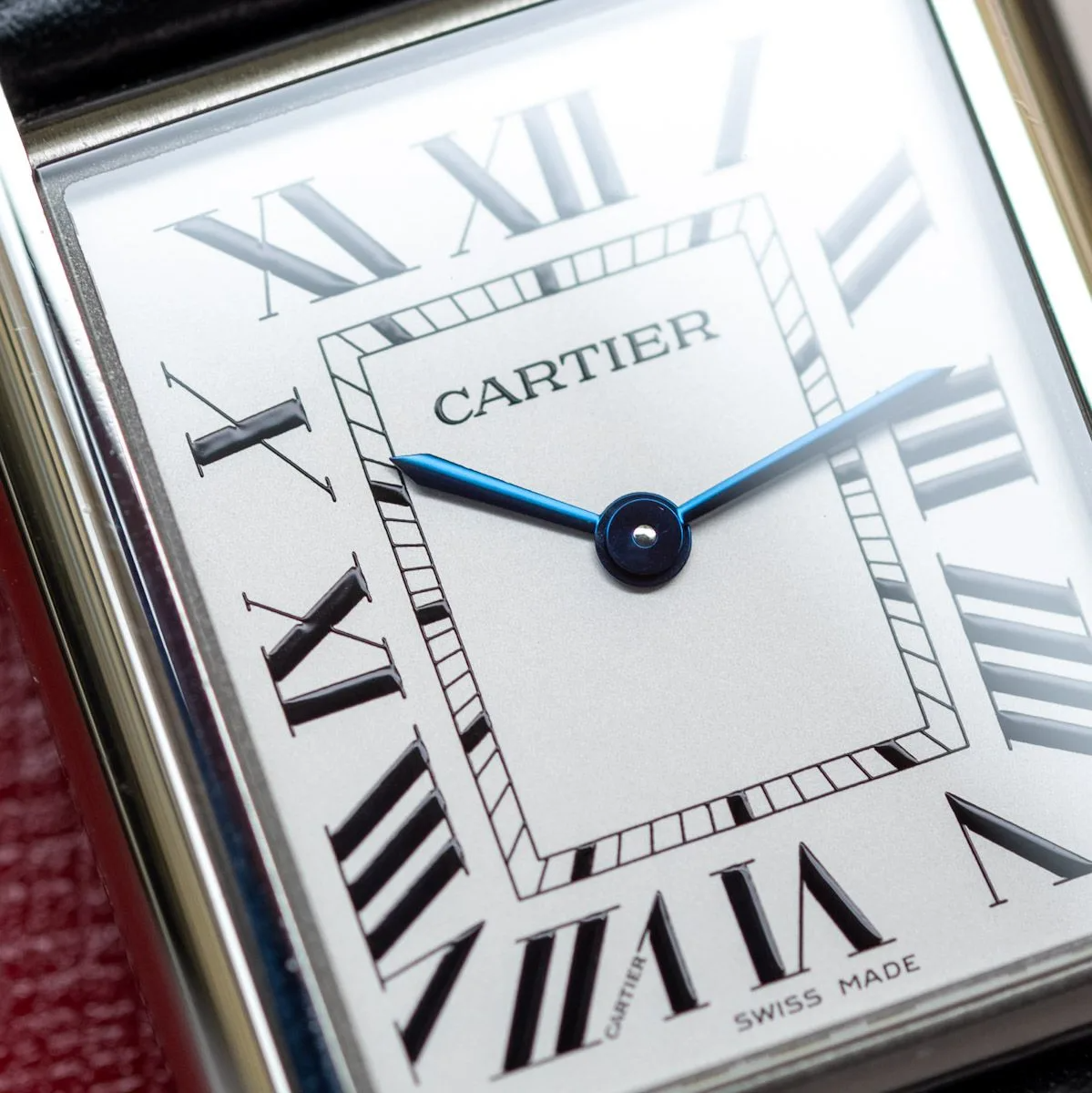 The Cartier Tank Must de Cartier watch in its large model features a rectangular steel case, a white lacquered dial, and a steel ardillon buckle. It is powered by a high autonomy quartz movement. The watch is water-resistant up to 3 bar (approximately 30 meters). The dimensions of the case are 33.7 mm x 25.5 mm with a thickness of 6.6 mm. It also features a beaded crown set with a synthetic cabochon-shaped spinel, and sword-shaped hands.