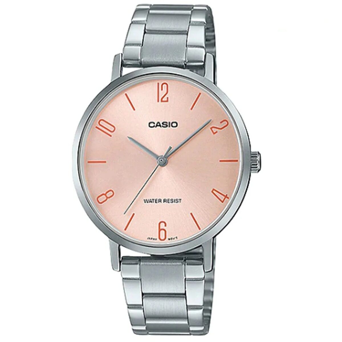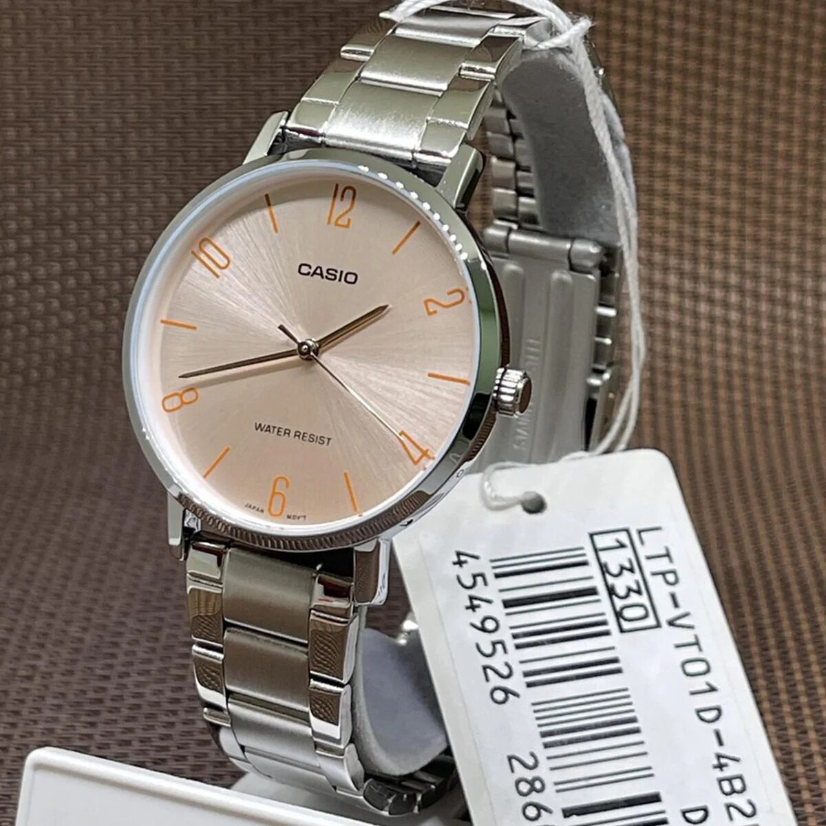 The Casio LTP-VT01D-4B2UDF is a stylish women’s analog watch featuring a stainless steel case & band, a rose gold/pink dial, and a classic round shape, offering water resistance for daily wear, a 3-year battery life, and reliable quartz movement with standard 3-hand timekeeping, making it a versatile, durable, and elegant accessory.