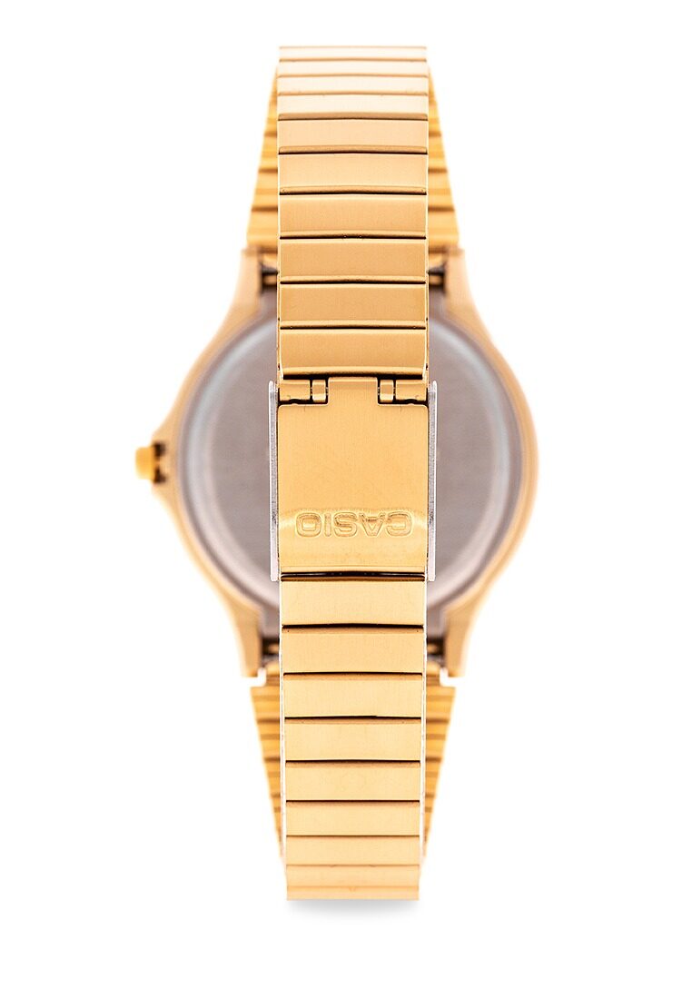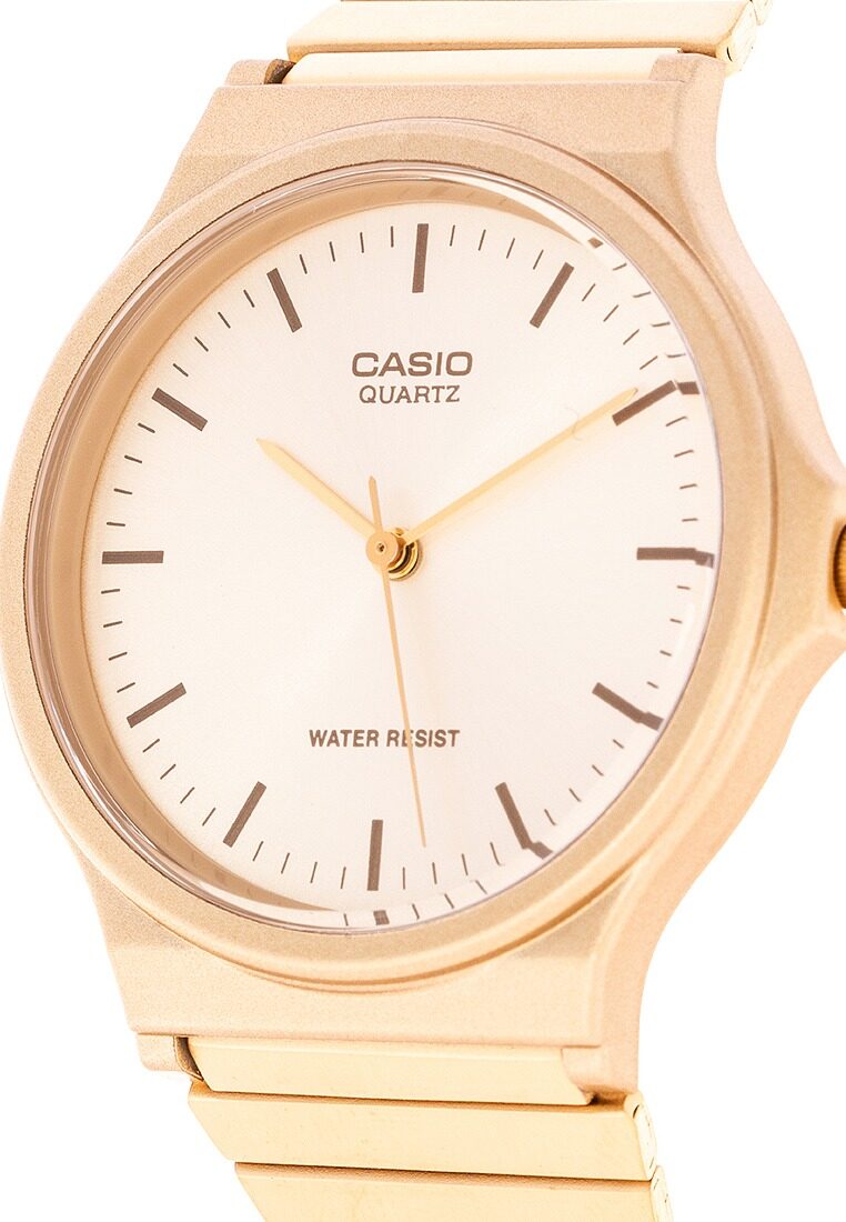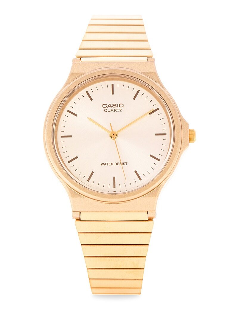 The Casio MQ-24G-9EDF is a classic, lightweight, gold-toned analog watch known for its minimalist style, featuring a gold dial, gold stainless steel band, resin case, and quartz movement for accurate timekeeping, offering splash resistance and a versatile, retro-chic look suitable for everyday wear.
