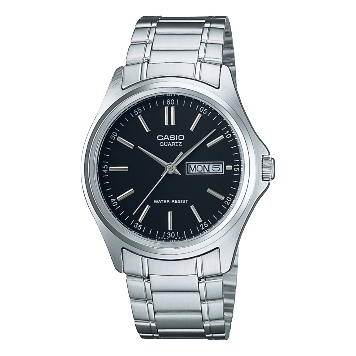 The Casio MTP-1239D-1ADF is a classic, unisex analog wristwatch featuring a black dial and stainless steel case and band. It has a precise Japan quartz movement, a mineral crystal, and a day-date display at the 3 o’clock position. The watch is water-resistant, has a one-touch 3-fold clasp for secure wear, and a typical battery life of approximately two years.