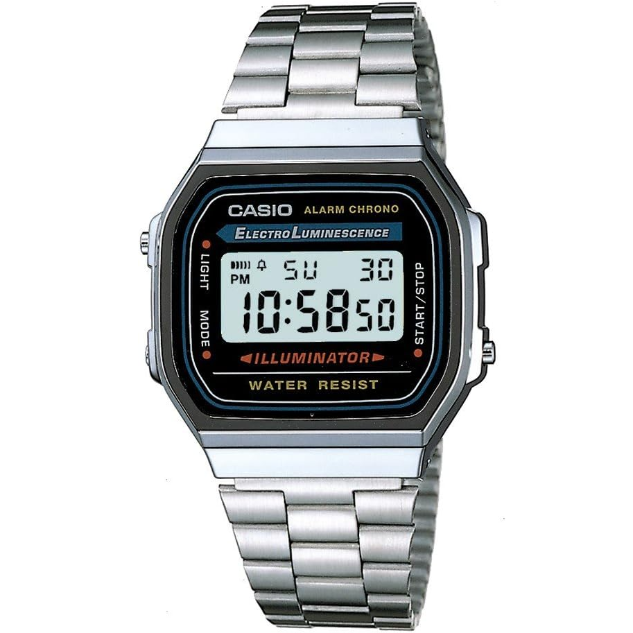 The Casio A168WA is a vintage-inspired digital watch known for its simple, versatile style and stainless steel construction. It features a 1/100-second stopwatch, daily alarm, auto-calendar, and an electro-luminescent backlight for low-light visibility. The watch is water-resistant, has a 7-year battery life, and a stainless steel band with an adjustable clasp.