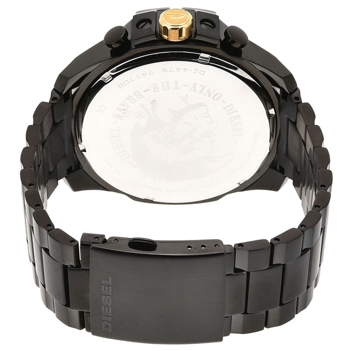 The DZ4479 is a Diesel Mega Chief men’s chronograph watch featuring a bold, oversized, black ion-plated stainless steel case and a three-link black stainless steel bracelet. It has a distinctive gray dial with a “Only the Brave” tag, three subdials for chronograph function, and a date window. The watch is powered by a quartz movement, has mineral crystal glass to resist scratches, and is water-resistant up to 10 ATM (100 meters), making it suitable for shallow diving.