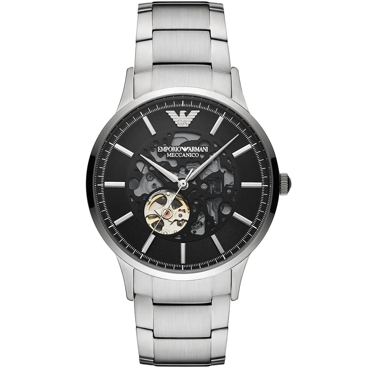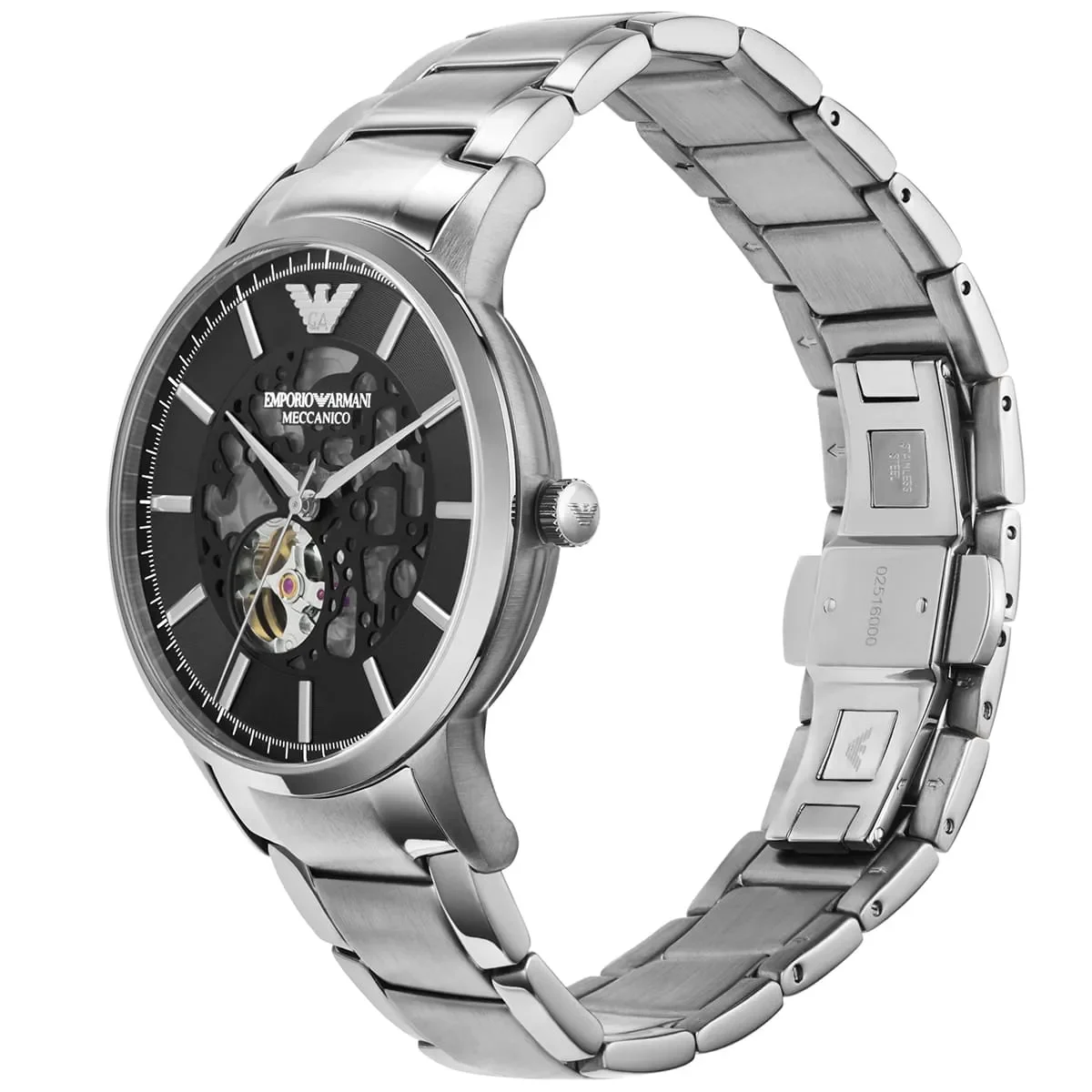 The Emporio Armani Renato AR60055 is a stylish men’s automatic watch featuring a 43mm stainless steel case and bracelet, a black skeleton dial with open-heart detail to view the movement, and 5 ATM water resistance, blending modern design with mechanical watchmaking for a sophisticated, everyday accessory.