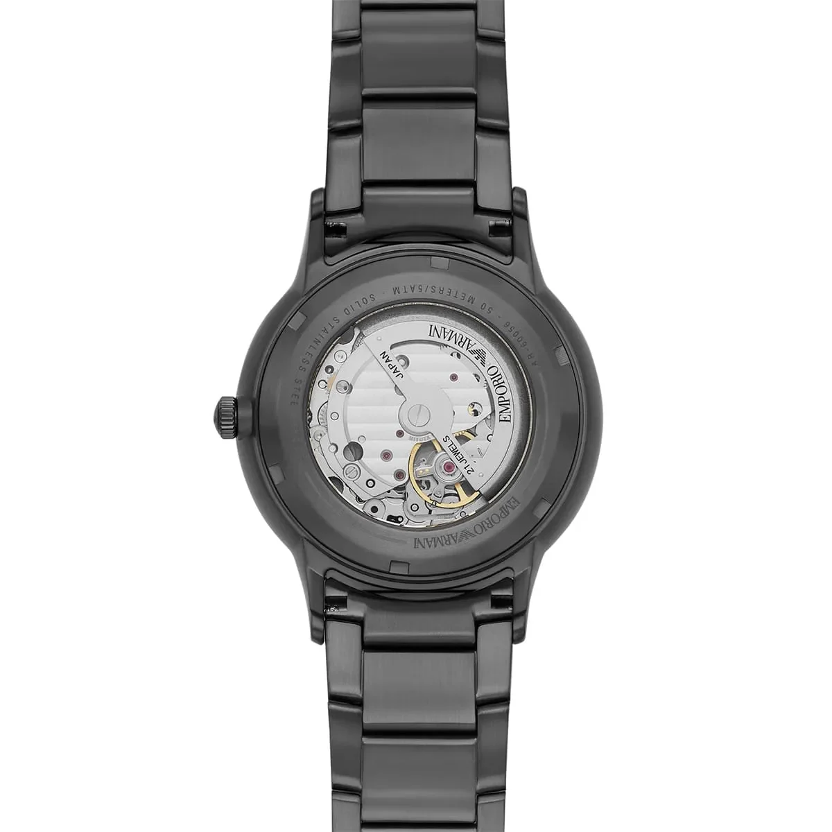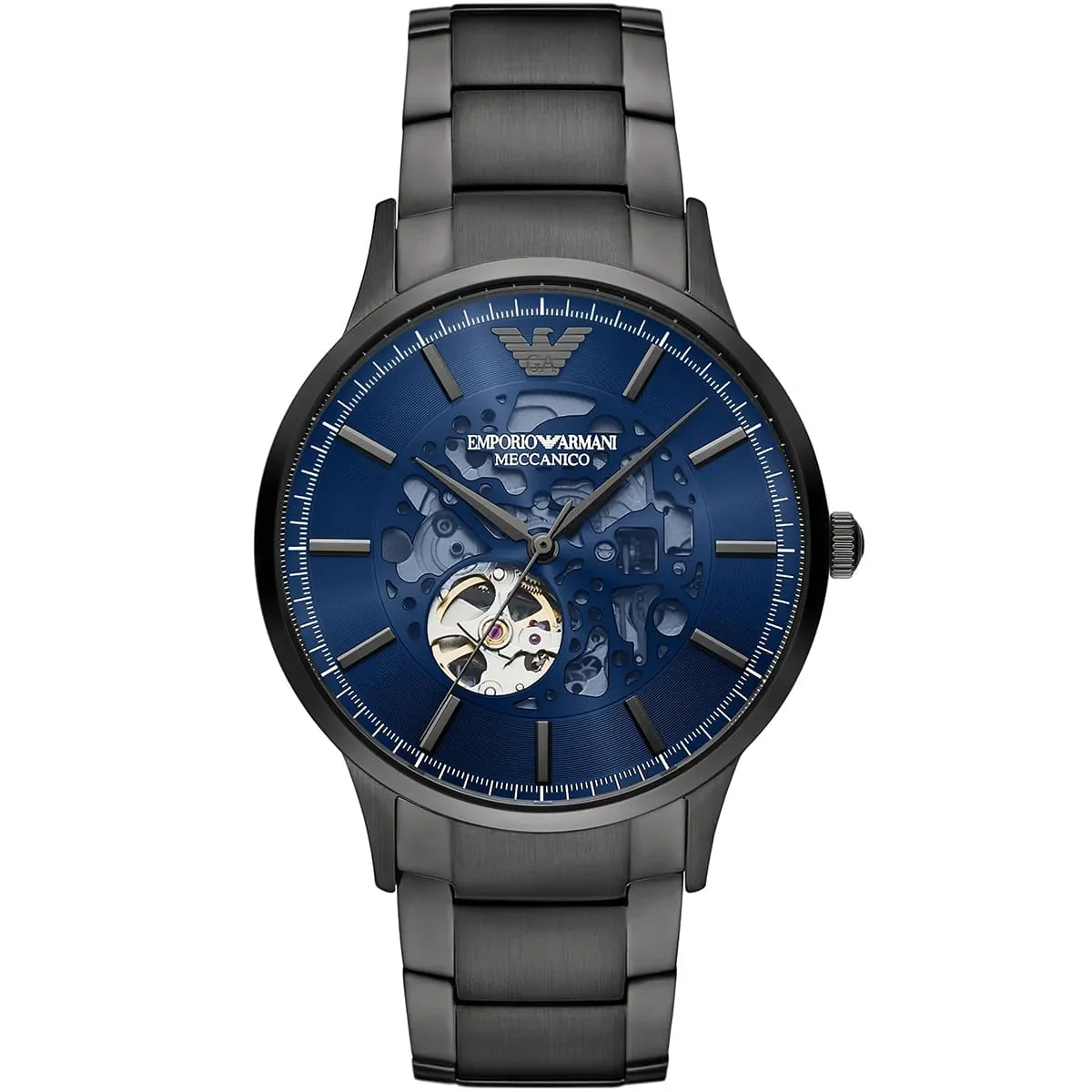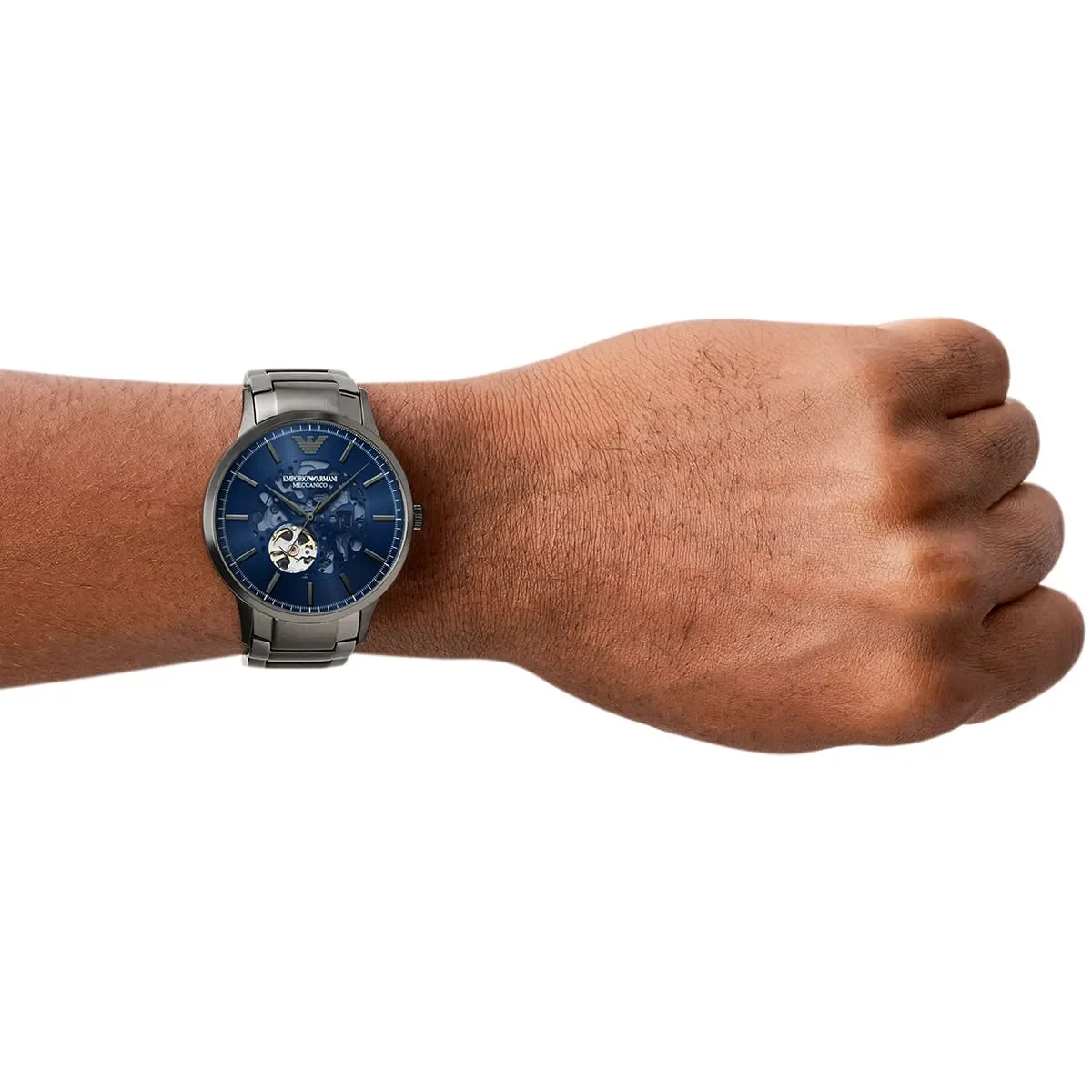 The Emporio Armani Renato AR60056 is a stylish 43mm men’s automatic watch featuring a dynamic blue multi-layer dial with an “open heart” window to view the movement, housed in a gunmetal stainless steel case and paired with a matching bracelet, offering a modern, tech-inspired look with a secure deployment clasp and 50m water resistance.