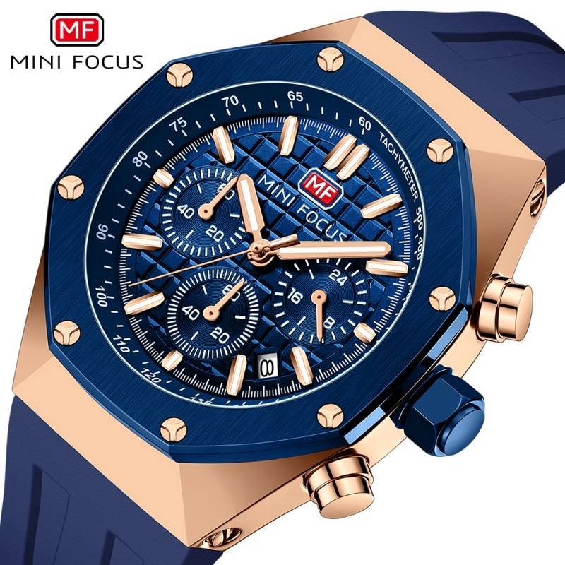 Mini Focus Blue Silicone Strap, Gold Bezel, Blue Dial Chronograph Quartz Watch for Gents