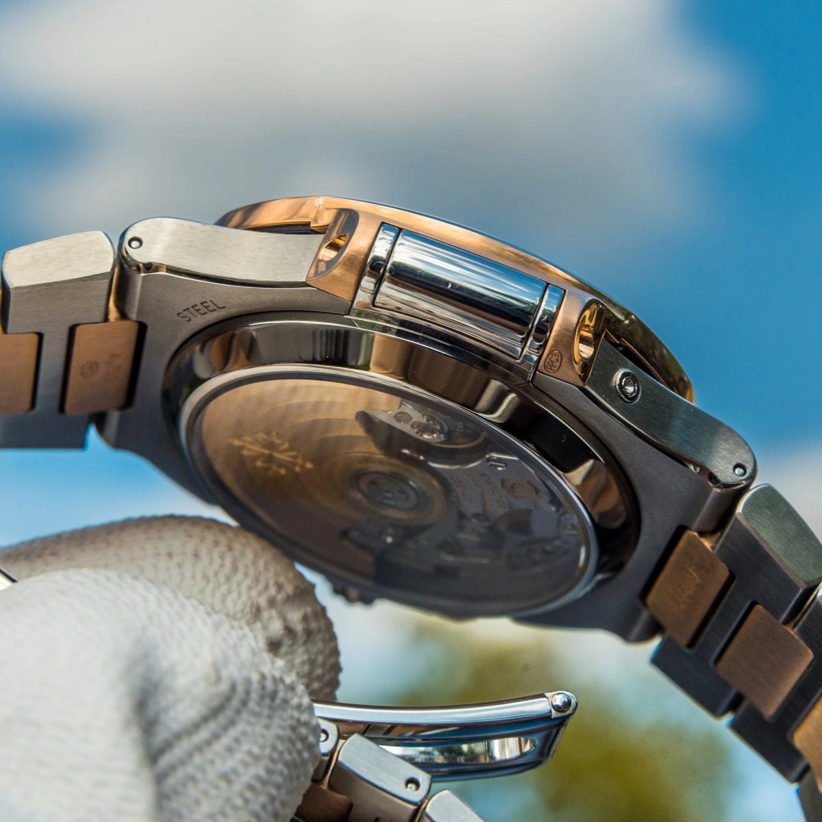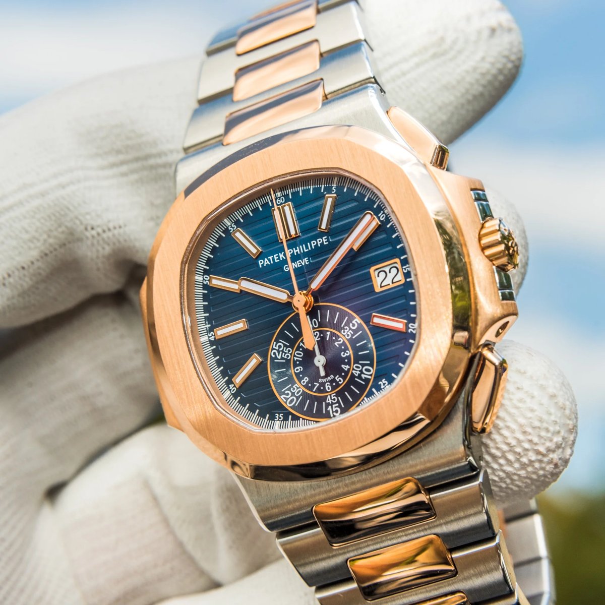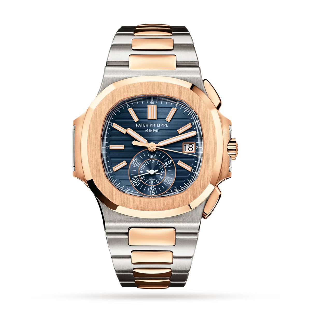 40.5mm stainless steel and 18K rose gold case, sapphire crystal back, blue gradient dial with gold applied hour markers with luminescent coating, self-winding Caliber CH 28-520 C movement with date, chronograph, 60-minute and 12-hour monocounter at 6 o’clock, sweep seconds hand (chronograph hand), approximately 45-55 hours of power reserve, stainless steel and 18K rose gold bracelet Nautilus fold-over clasp.