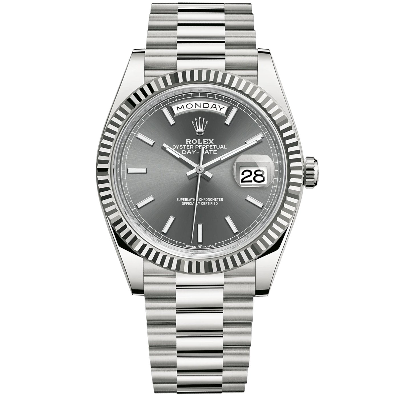 The Rolex Day-Date President White Gold Slate Striped Dial Fluted, reference 228239, is a 40mm Oyster watch with a fluted bezel and a President bracelet, all in white gold. It features an instantaneous day and date display with rapid-setting, a self-winding Calibre movement, and a sapphire crystal with a Cyclops lens over the date. The “Slate Striped” dial is a specific detail for certain variants of this model, distinguishing it with a patterned rhodium or silver-toned surface.