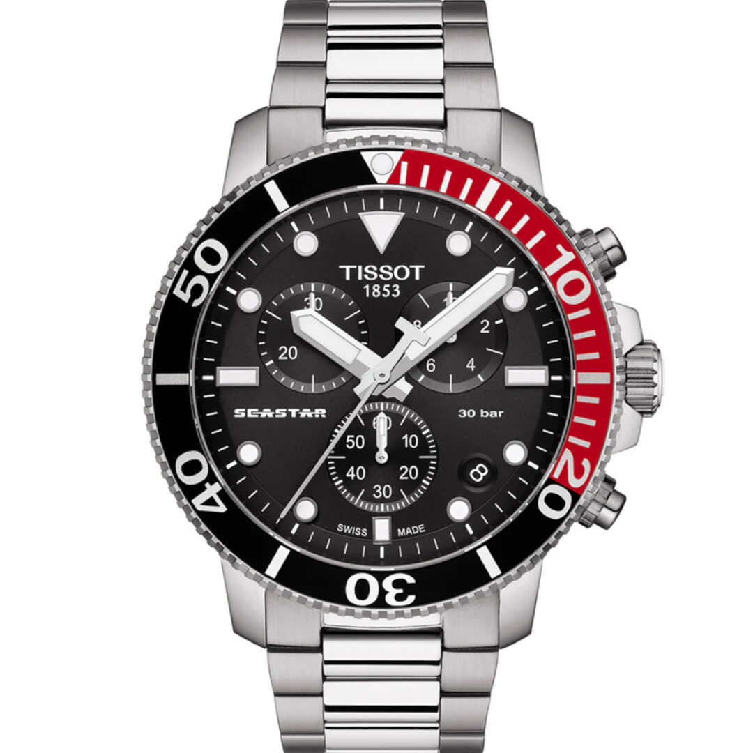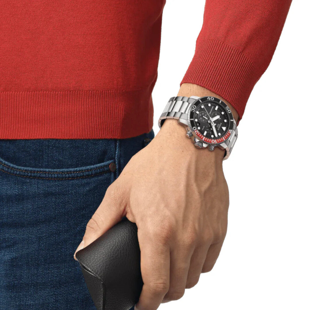 The Tissot T120.417.11.051.01 is a men’s Seastar 1000 Chronograph dive watch from the T-Sport collection. It features a Swiss quartz movement, a 300m (30 ATM) water resistance rating, a scratch-resistant sapphire crystal, and a 316L stainless steel case. Key functions include a chronograph with a 1/10 of a second counter, a central 60-second hand, a 30-minute counter, a date display, and a unidirectional rotating bezel with an aluminum ring.