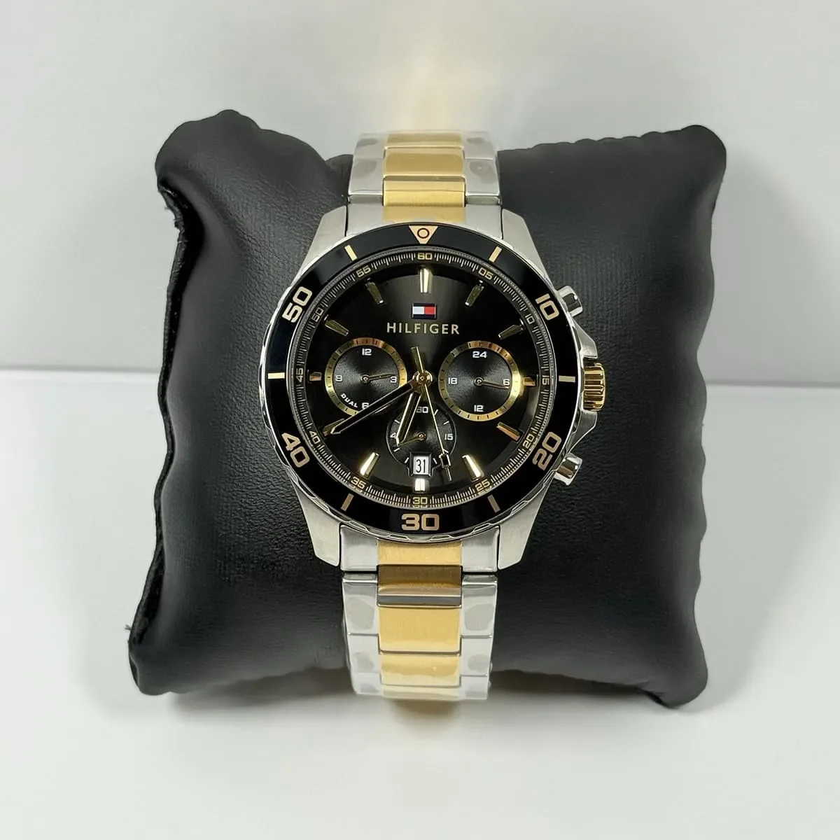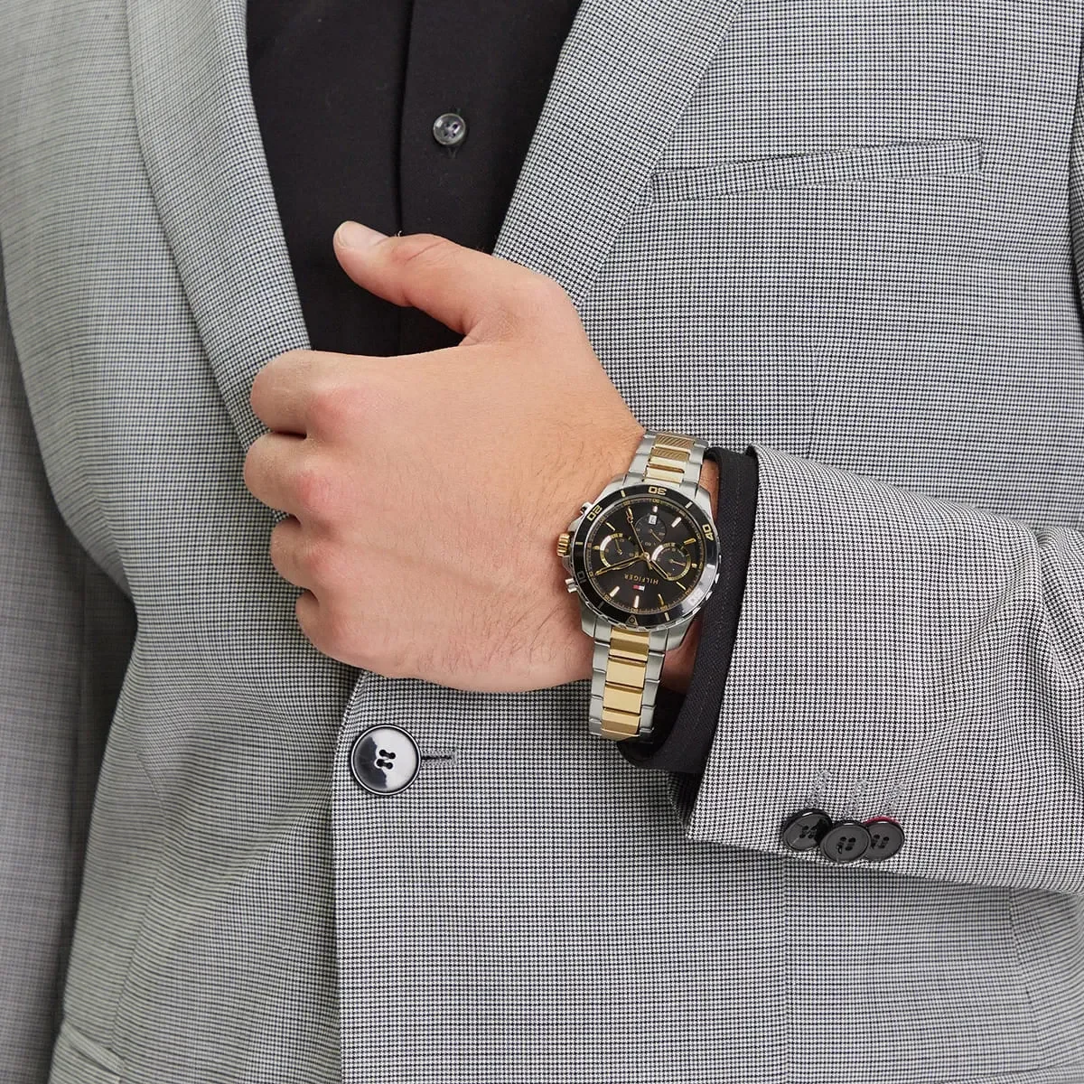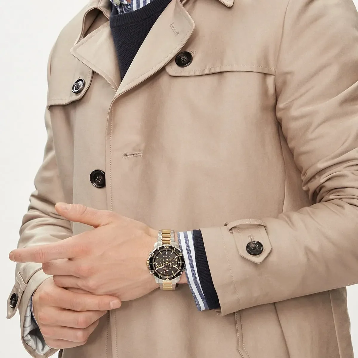 The Tommy Hilfiger Jordan 1792095 is a men’s two-tone stainless steel chronograph watch featuring a 43mm case, a black dial with gold accents, date display, subdials, and 50m water resistance, blending classic American prep with modern style for a sophisticated look. It uses reliable quartz movement and a secure fold-over clasp for everyday wear and offers a mix of functionality and fashion.